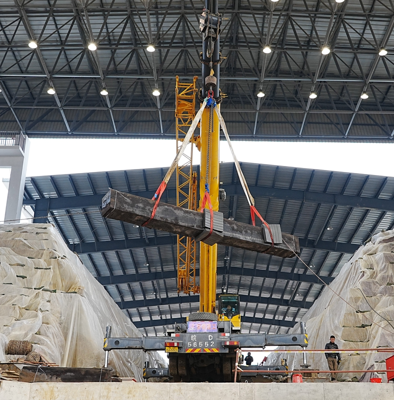 Staff members operate a crane to lift a outer coffin slab of the Wuwangdun tomb discovered in Huainan, east China's Anhui Province, April 14, 2024. [National Cultural Heritage Administration/Handout via Xinhua]
