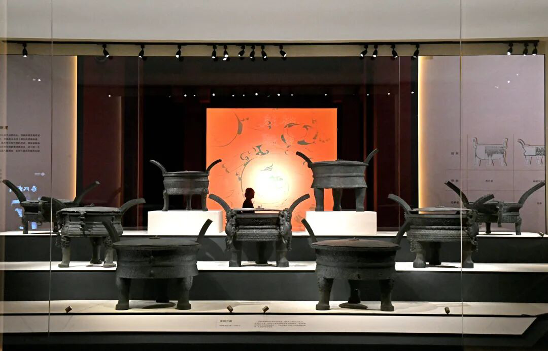 Visitors are viewing Nine Tripod Ding Vessels of the Son of Heaven, unearthed from Tomb No. 1 of Wuwangdun at the National Museum of China