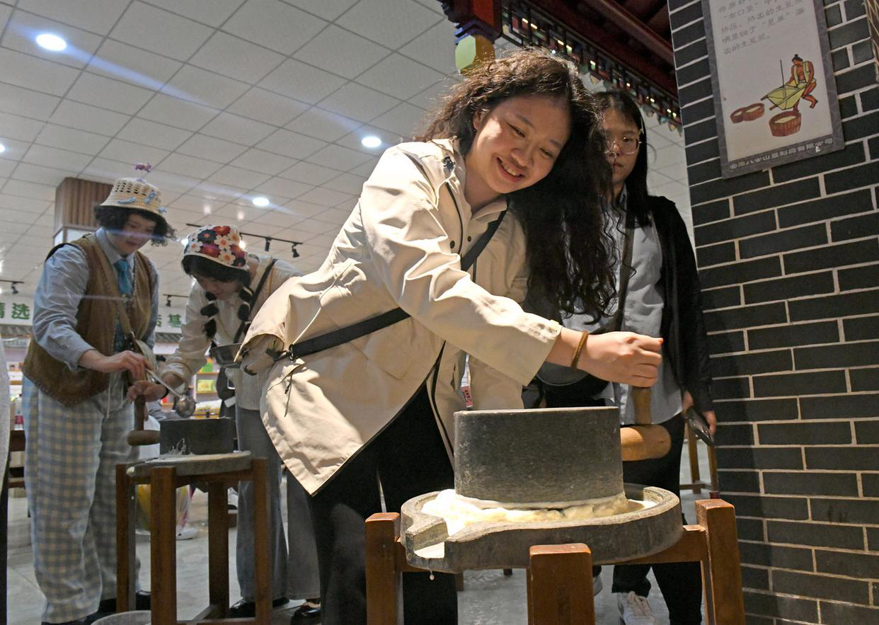 Taiwanese youths experience traditional tofu making techniques at Shouxian Tofu Theme Cultural Park in Huainan City, Anhui Province