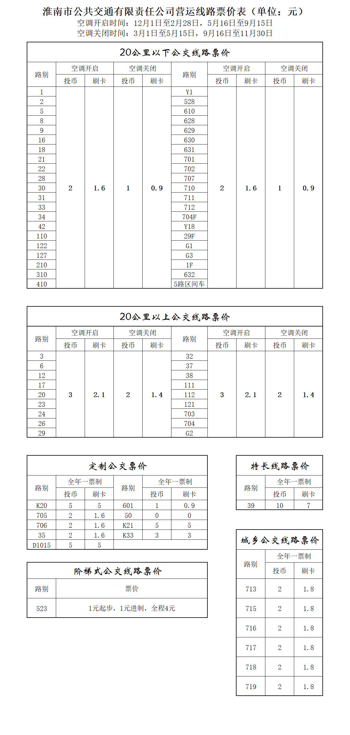 淮南市公共交通有限责任公司营运线路票价表