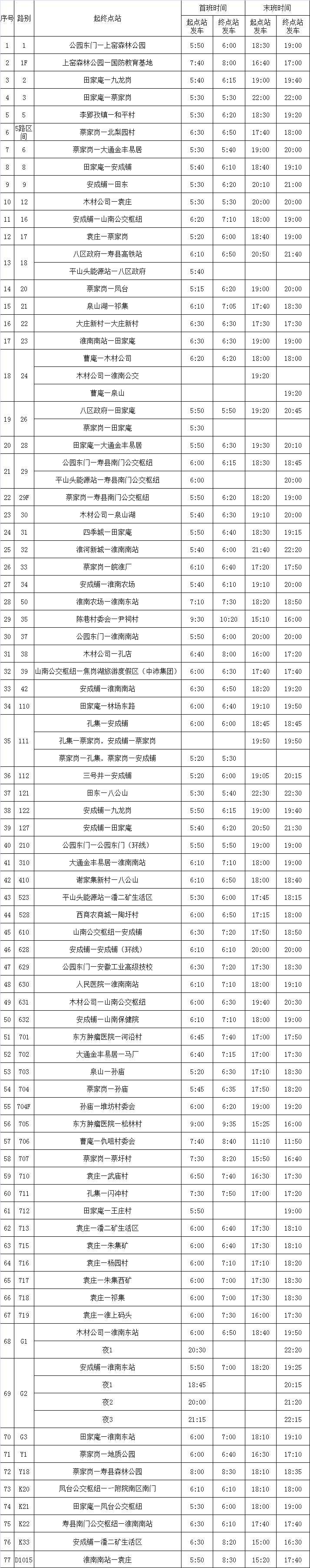 2025年度淮南公交夏秋季营运线路首末班时间表