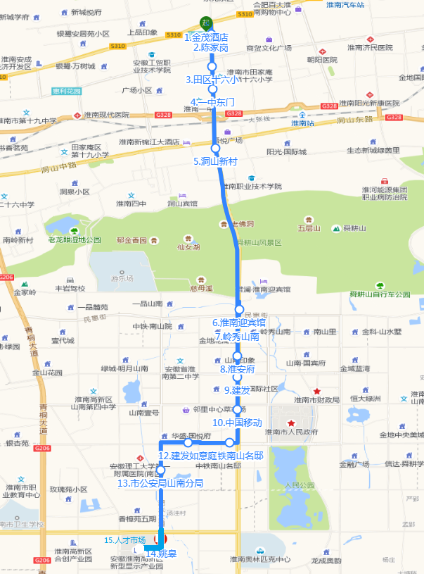 金茂酒店、陈家岗、田区十六小、一中东门、洞山新村、淮南迎宾馆、岭秀山南、淮安府、建发、中国移动、中铁南山名邸、建发如意庭、市公安局山南分局、姚皋、人才市场。