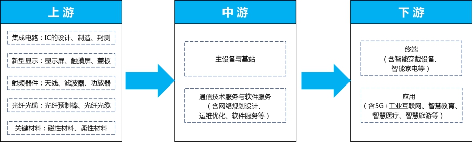 近年来,5G产业链的内涵不断丰富,已从单一的主产业链演化成为既包括主产业链,又包括支撑产业链的科学内涵。5G主产业链的上游包括集成电路、新型显示、射频器件、光器件、光纤光缆等各类器件材料;5G主产业链的中游主要包括主设备、基站及通信网络技术服务;5G主产业链的下游包括终端与应用,通过智能手机、智能家电、智能穿戴设备等终端将5G技术应用于各垂直场景。5G支撑产业链是5G与其它ICT产业深度融合所形成的新兴产业业态,包括5G与物联网、人工智能、大数据、云计算等产业融合领域。5G与其它ICT技术融合共同构筑了万物互联网的基础设施,为万物互联提供坚实支撑。