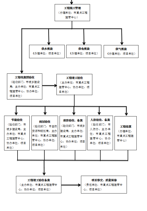 市重点工程建管中心负责项目建设阶段的现场管理协调、工程质量、安全生产、技术档案管理、进度款拨付、工程决算编制、工程竣工验收及移交等工作。