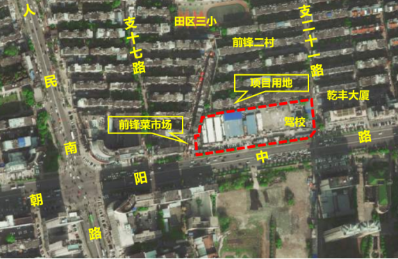 本控规地块位于田家庵区朝阳中路和人民南路交叉口东北侧前锋二村入口处,规划地块西侧紧邻前锋菜市场,北侧为前锋二村,南邻朝阳中路,东侧为乾丰大厦,规划用地总面积为1.04公顷(约合15.53亩)。
