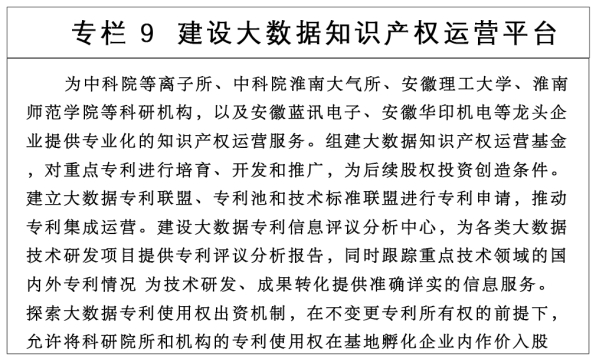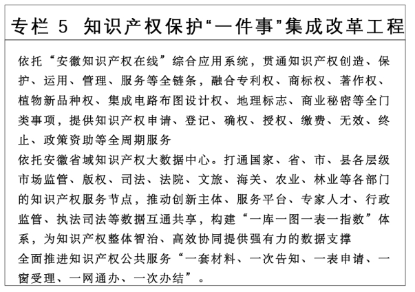 提高知识产权信息传播效能。依托国家知识产权大数据中心、高校国家知识产权信息服务中心、江淮大数据中心及“皖事通办”平台 围绕六大新兴产业 整合知识产权公共服务资源, 探索建设特色专题数据库,实现专利、商标、版权、地理标志、集成电路布图设计和植物新品种等基础信息开放共享。支持行业组织、产业园区、试点示范区、服务业集聚区等建设差异化知识产权公共服务网点。支持社会化机构提供知识产权预警分析等高层次的知识产权信息服务。(市发展改革委 市财政局,市农业农村局,市文化和旅游局,市市场监管局,市林业局,市数据资源局,市粮食和物资储备局,各县、区人民政府等按职责分工负责)