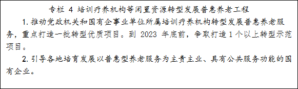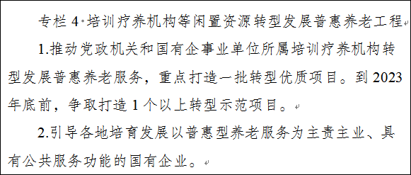 2.推动培训疗养机构转型发展普惠养老服务。按照“脱钩是原则,保留是例外”的原则,推动培训疗养机构与党政机关等脱钩。坚持应改尽改、能转则转,推动党政机关和国有企事业单位所属培训疗养机构主要转型为医养结合、社区嵌入等普惠型养老服务设施,不得以养老名义经营其他业务。各县区要建立绿色通道,本着尊重历史的原则,积极协调解决培训疗养机构历史遗留问题。2023年底前,争取打造1个转型示范项目。