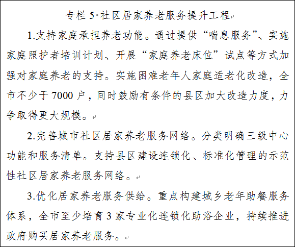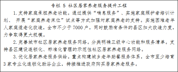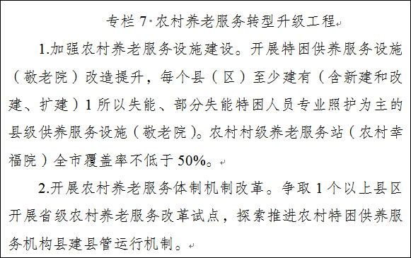 6.农村养老不断加强。加大农村养老服务设施建设力度,推进特困供养机构转型升级,全市127家特困供养机构在满足政府兜底服务对象集中住养需求的前提下,转型为养老服务中心。实施特困供养机构改造提升三年行动,加强护理型床位建设。加强农村老年人关心关爱服务,建立完善农村老年人家庭赡养协议签订、农村留守老年人联系登记、农村特殊老年群体探视走访“三项制度”。探索以邻里互助、志愿服务与低偿报酬相结合的互助式农村养老服务模式。