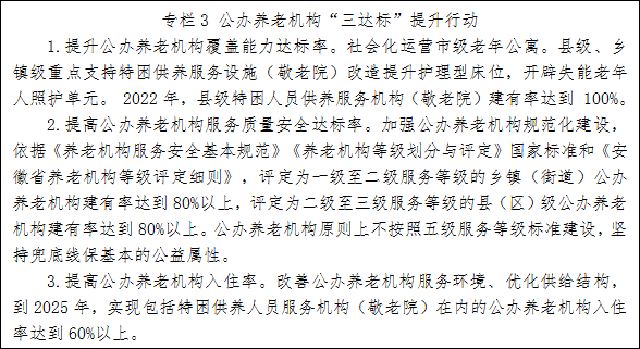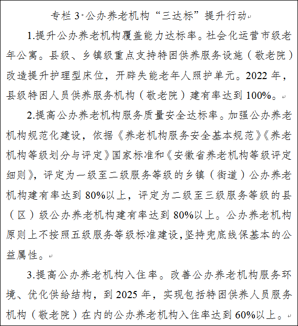 5.强化公办养老机构兜底保障作用。充分发挥公办和公建民营养老机构兜底保障作用,公办养老机构优先接收经济困难的失能失智、孤寡、残疾、高龄老年人以及计划生育特殊家庭老年人、为社会做出重要贡献的老年人,并提供符合质量和安全标准的养老服务。建立公办养老机构入住轮候制度,明确老年人轮候前提条件和排序原则。实施公办养老机构“三达标”提升行动,重点支持新建面向失能失智老年人的老年养护院和特困人员供养服务机构(敬老院),根据特困人员等重点人群规模确定床位下限。加大存量公办养老服务设施改造,提升失能老年人照护服务,增设失智老年人护理专区,推动消防施提升改造。加强区域性具备护理功能的公办养老机构建设。加强光荣院建设。