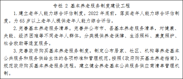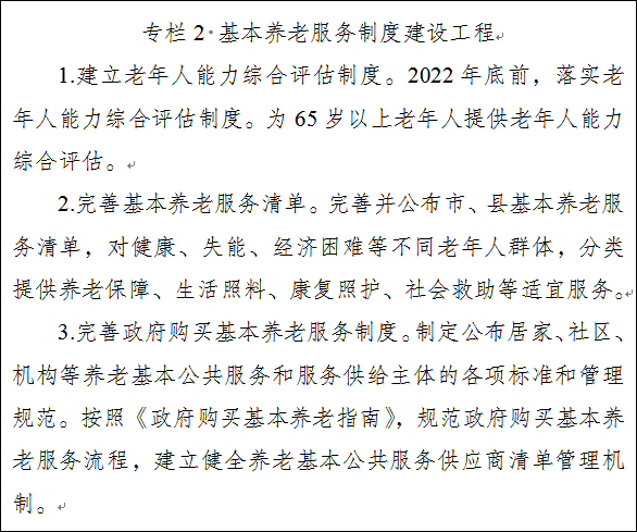 1.建立健全基本养老服务制度。统筹老年人能力、需求、健康、残疾、照护、消费等评估,开展老年人能力综合评估。评估结果作为领取补贴、接受基本养老服务的重要参考依据。依据省老年人能力综合评估标准,为65岁以上老年人提供老年人能力综合评估。通过政府购买服务等方式,推动建设一批综合评估机构,加强人员培训和能力建设。完善并公布市、县基本养老服务清单,明确服务对象、服务内容、保障标准、支出责任,并根据经济社会发展和科技进步进行动态调整。根据市、县区财政承受能力,对健康、失能、经济困难等不同老年人群体,分类提供养老保障、生活照料、康复照护、社会救助等适宜服务。完善政府购买基本养老服务制度,规范政府购买基本养老服务流程,鼓励更多市场主体为老年人提供专业化的基本养老服务。