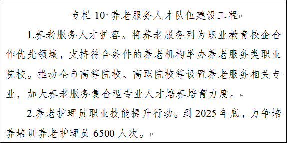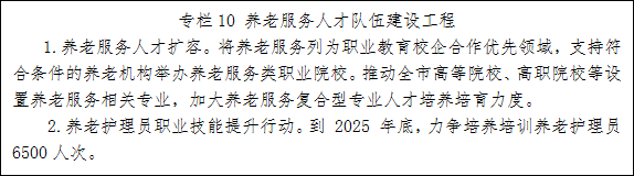 7.优化养老服务从业人员队伍。拓宽养老服务人才培养途径。将养老服务列为职业教育校企合作优先领域,支持本地高校和中职学校、技工院校开设老年服务与管理类专业及相关课程,支持符合条件的养老机构举办养老服务类职业院校。开展养老服务机构从业人员职业技能提升行动,到2025年,力争培养培训养老护理员6500人次。完善养老护理员薪酬待遇、学费补偿、入职奖补等政策,建立健全养老护理员职业技能等级认定制度,建立职业技能等级与工资收入、福利待遇、岗位晋升、服务价格等挂钩政策,促进养老护理员收入合理增长。发展养老社工队伍,依托社工服务站提供护理指导、心理慰藉等服务,到2025年,每千名老年人和每百张养老机构床位均配备1名社工。逐步建立养老服务业发展的职业经理人机制,促进经营管理职业化,造就一批养老服务领域的管理型领军人才和科技型领军人才。举办养老护理员职业技能竞赛,开展养老护理员褒扬等活动。