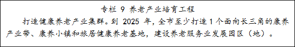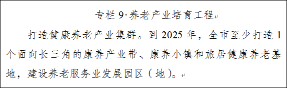 2.促进产业融合发展。实施“养老服务+行业”行动,促进养老服务与文化、旅游、餐饮、体育、家政、教育、养生、健康、金融、地产等行业融合发展。依托我市山水资源和旅游规划,至少打造1个面向长三角的康养产业带、康养小镇和旅居健康养老基地。培育发展适老化的养老地产,拓展房地产业态,支持开发老年宜居住宅和代际亲情住宅。