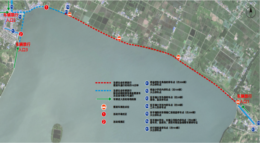3、前往比赛区域的社会车辆(含非机动车),请停放在老庙桥东北角临时停车点,老庙小学院内、安丰塘镇政府东侧唐人街及与323省道相通的支路,请有序、规范停放。