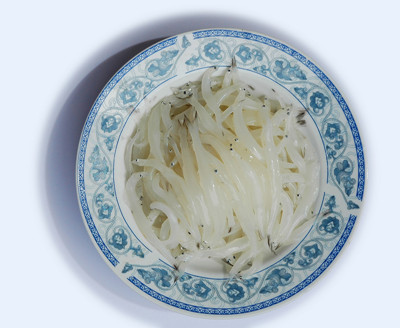 银鱼,古称脍残鱼、白小,杜甫“白小群分命,天然二寸鱼”诗句即指此鱼。银鱼头扁平,体细长,光滑透明,洁白如银,体长1-2寸。银鱼每年三、四月间繁殖,寿命仅一年,母鱼在水草丛生的湖湾河口产卵,每条能产卵几千粒,产卵后即死去。卵化后能迅速生长,五月和九月两季捕捞,产量较多。银鱼肉质细嫩,鲜美可口,营养丰富,每百克含蛋白质8.2克,脂肪0.3克。由于出水鲜银鱼易死、易化,捕捞后多立即曝晒成干银鱼。银鱼可做炒莱,烩菜、汤菜等几十种佳肴,清代被列为贡品。