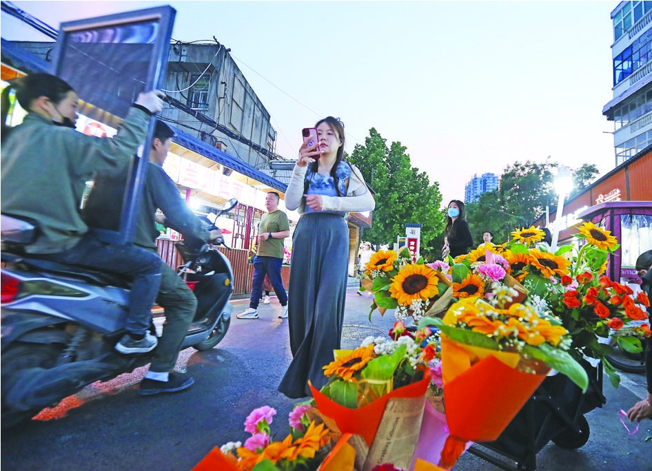 傍晚,前锋美食街,一位女士从鲜花摊位前走过。