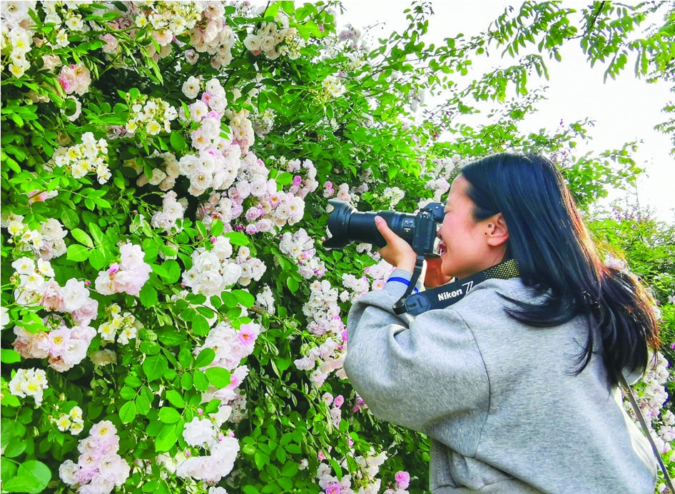 淮南蔷薇花盛开,吸引市民前来拍照留影。