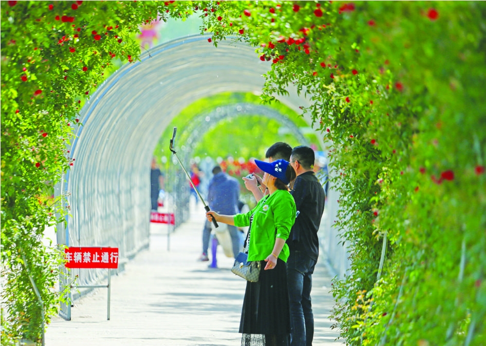 焦岗湖影视城景区举办首届“焦岗湖月季花会”,吸引市民前来观赏。