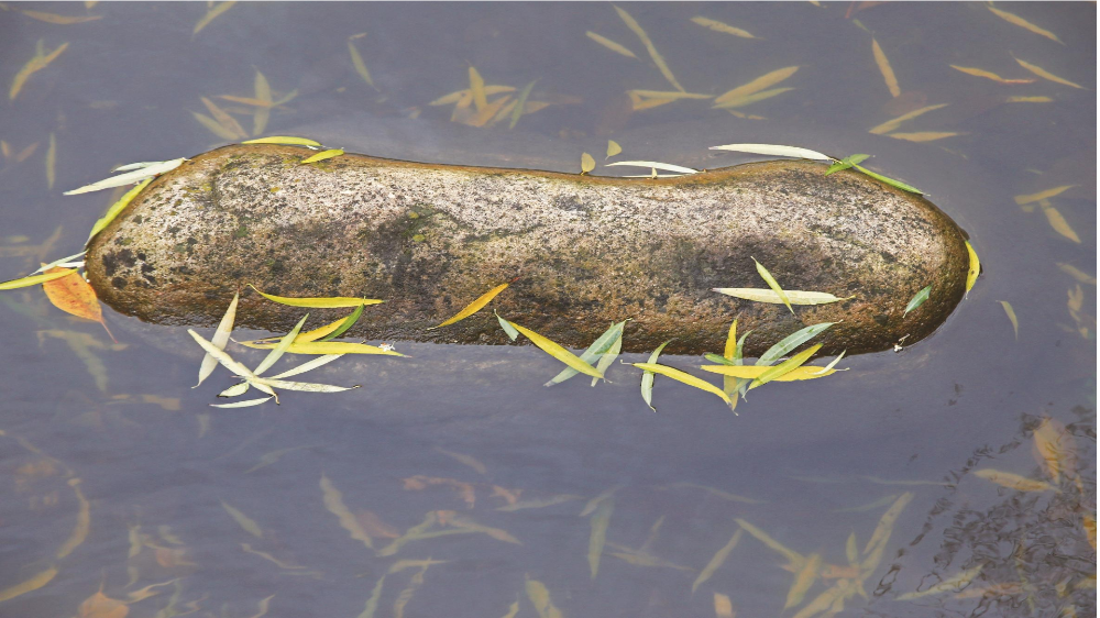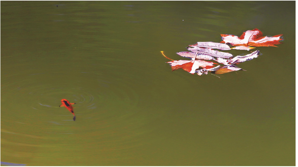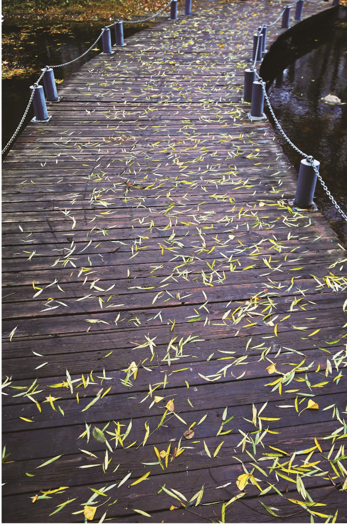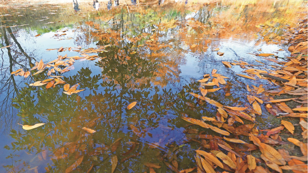 落叶飘浮在水面,色彩斑斓宛如油画。