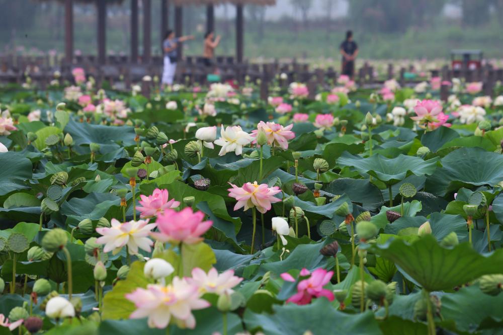 焦岗湖荷花竞相绽放,吸引了游客前来赏花、拍照。