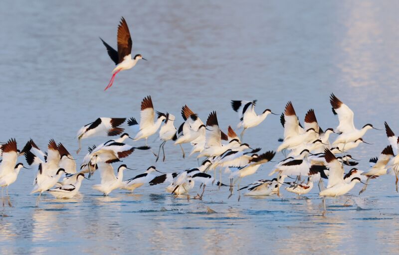 近日,淮河两岸越冬的候鸟开始活跃,准备开春后向北迁徙。图为大通区蔡城塘里的反嘴鹬、黑翅长脚鹬在飞行嬉闹。