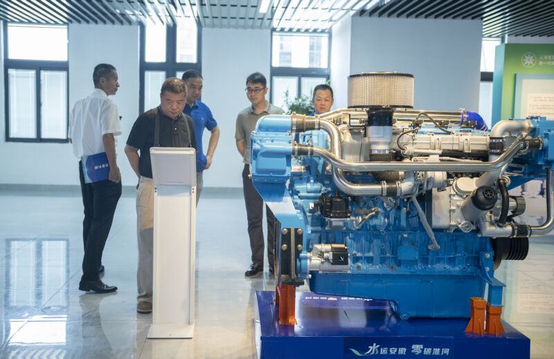 图为安徽江淮绿色船舶科学研究院展厅,人们在观看甲醇单燃料船用发动机。
