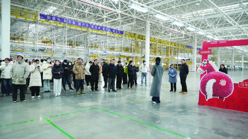 上午九点,几辆满载返乡人员的公交车从三和镇政府出发。窗外,现代化的厂房鳞次栉比,宽阔的道路四通八达,与游子们记忆中的家乡模样已然不同。参访首站,来到新能源汽车领域的代表企业——开沃汽车(淮南)有限公司。在总装车间内,自动化生产线高效运转,机械臂精准舞动,高效完成车辆零部件装配。在苏州工作多年的陈文理,看得格外专注。“以前觉得高端制造都在沿海,没想到家乡的企业也这么现代化!”他忍不住用手机记录下眼前的场景,“如果能找到适合的岗位,我准备年后就不走了,留在家乡工作。”陈文理表示。