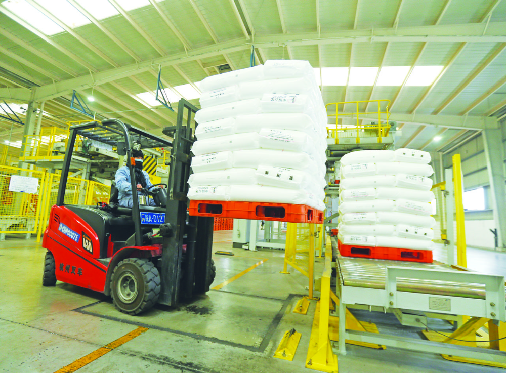 近日,中安联合煤化有限责任公司聚烯烃产品包装车间一派繁忙景象。该公司主要生产煤制甲醇、聚乙烯、聚丙烯等产品,其中聚丙烯年设计产能35万吨,是主产品之一。目前,中安公司精心组织、优化操作,保持装置最优工况,确保各套装置高负荷安全运行,努力满足市场需求。