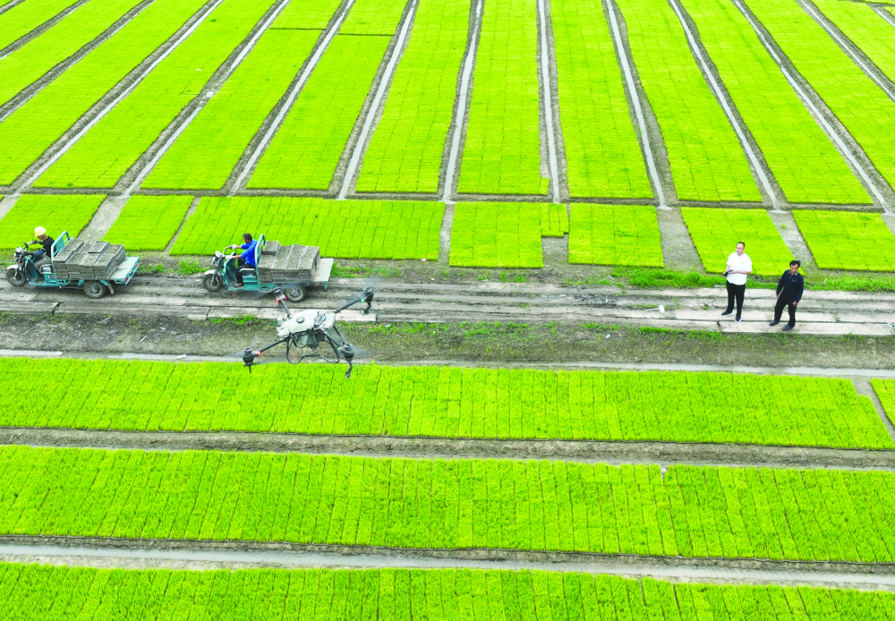 6月1日,凤台县桂集镇颜敏农机服务专业合作社育秧工厂,农技人员利用无人机给水稻秧苗喷洒叶面肥。据了解,凤台县今年预计种植55万亩,目前有120多家现代化育秧工厂。这种“育种+插秧”为一体的订单生产方式,既节省了成本,又方便了农户,农民种粮积极性大大提高。