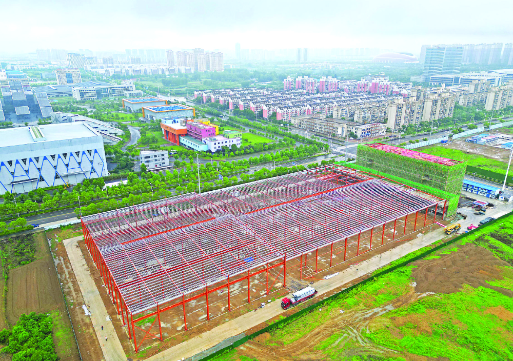 图为6月19日,高空拍摄建设中的淮南高新区安徽明然新能源汽车三合一电驱生产基地一期项目建设工地。据了解,该基地一期项目将建设1.8万平方米自动化数字化工厂,预计2023年11月底竣工、12月投产。该项目年产50万套BMS、BDU、IGW、CDC、域控等车规控制器产品,预计年产值达到25亿元。淮南基地将集研发、实验、生产为一体,成为成都明然智能科技有限公司的中心。