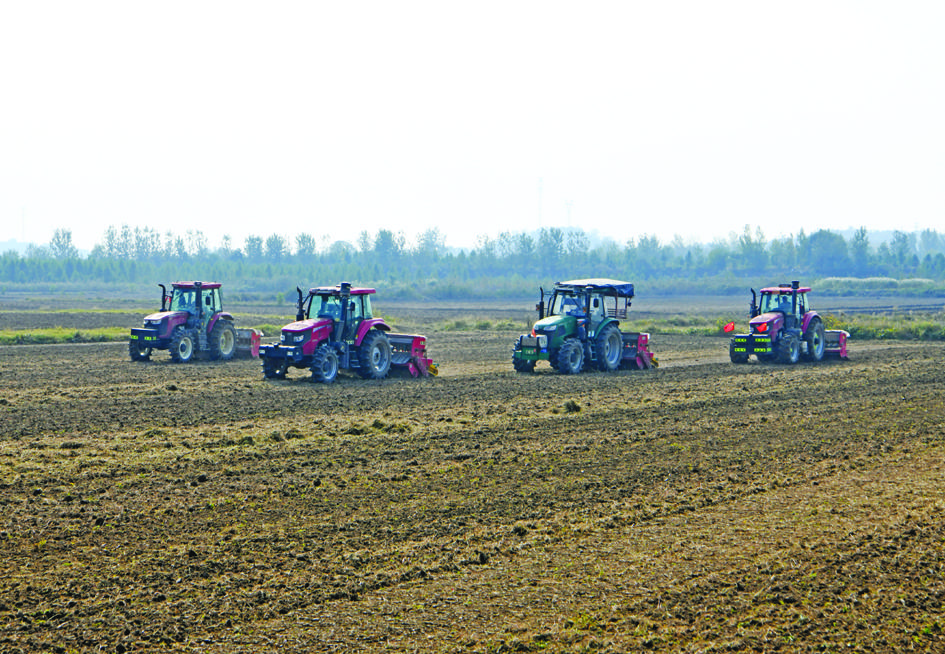 10月24日,凤台县刘集镇淝北村秋种现场,粮食种植专业合作社、种粮大户组织多功能一体农用机械统一种植小麦,实现旋耕、镇压、播种、施肥同步进行。当日是24节气霜降,农谚说“霜降种麦正当时”,淮河两岸田间地头一片忙碌的秋种景象。
