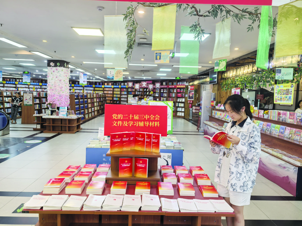 8月5日,市民在淮南新华书店选购党的二十届三中全会文件及学习辅导材料。近日,《中共中央关于进一步全面深化改革、推进中国式现代化的决定》《党的二十届三中全会〈决定〉学习辅导百问》等重要文件及辅导材料在淮南新华书店上架发行,书店设立主题陈列展台,积极推广系列图书,切实满足全市广大党员干部群众的学习需求。