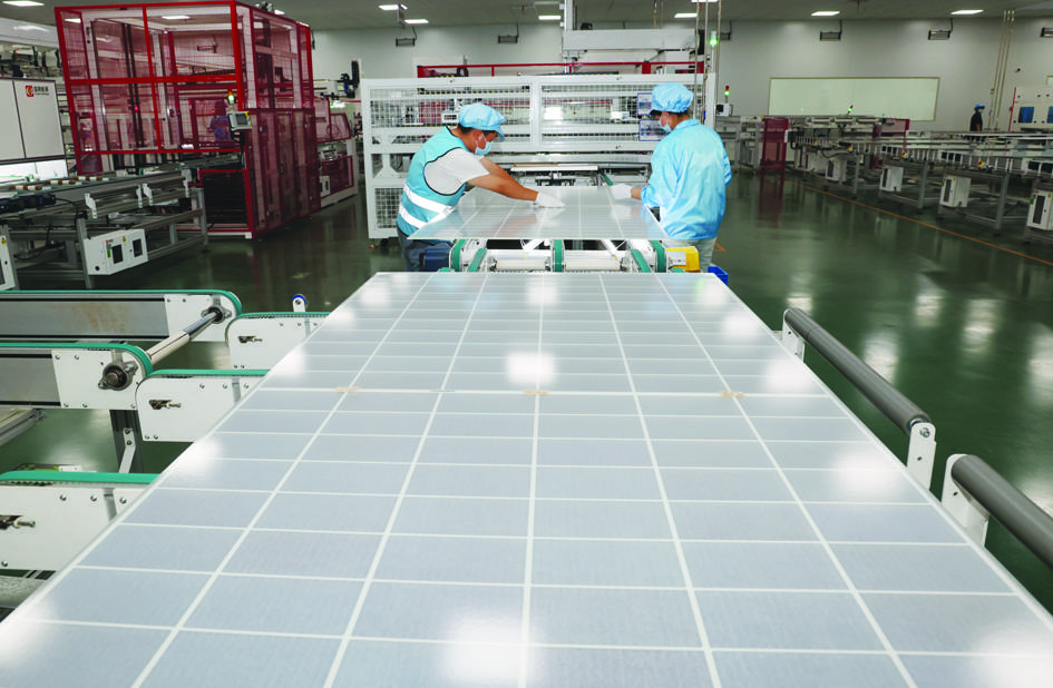 国晟科技(凤台)异质结双碳产业园主营异质结高效电池、高分子边框、大尺寸高效异质结组件等。拥有国内技术先进、效率高兼容性强的GW级异质结组件生产线,产品畅销海内外。园内安徽乾景宇辰公司2024年荣获两项发明专利,15项实用新型技术。其研发量产的无应力新型互联异质结组件,不仅有效提升了组件转换效率,更是大幅降低了材料成本。图为园区内企业车间生产场景。