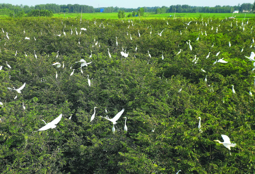 盛夏时节,寿县张李乡淠河湾绿意盎然、生态秀美。湾地东侧有一大片红榉树,数以千计的大白鹭齐聚枝头、群居生活,场面蔚为壮观。