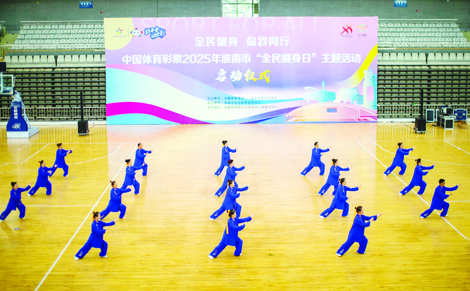 8月8日是第17个“全民健身日”。当日,由安徽省体育局、淮南市教育体育局主办,市社会体育指导中心承办的2025年淮南市“全民健身日”主题活动启动仪式在市体育馆举行。图为启动仪式上健身活动场景。