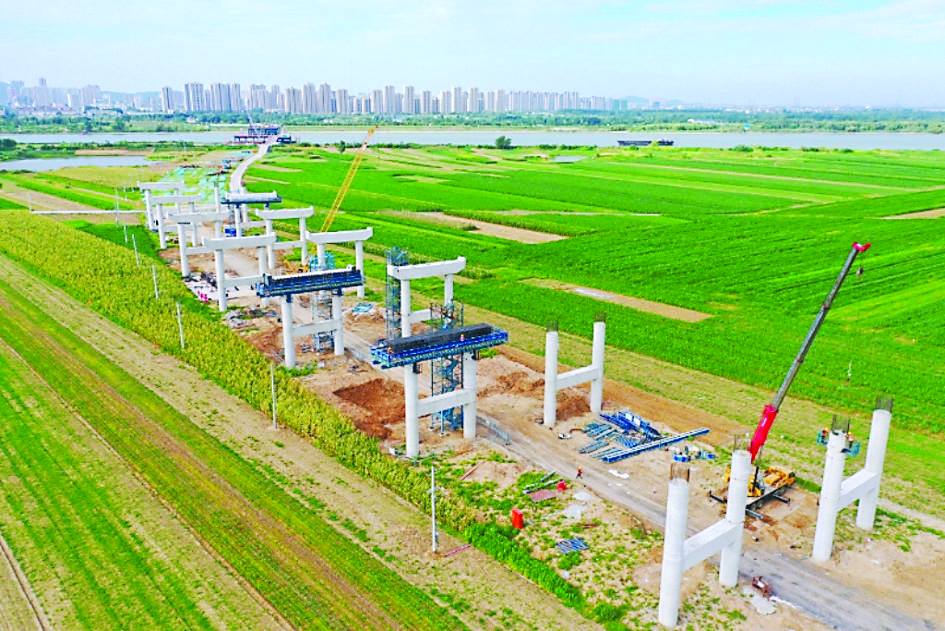 在建的淮南淮河大桥是国内最大跨度的独塔独柱混合梁斜拉桥。目前,在主塔及部分水面项目施工的同时,北引桥的桩基、墩柱等工程正同步推进。图为北引桥施工场景。