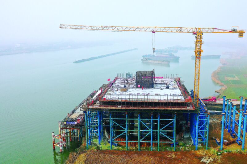 新年伊始,淮南淮河大桥工程建设快马加鞭。元旦期间,经过两天三夜的持续作业,大桥塔梁固结段混凝土顺利浇筑完成。此次浇筑的塔梁固结段设计方量2850立方米,采用C60混凝土一次性成型浇筑,体量庞大、结构复杂,是主桥施工的关键控制性节点,也标志着大桥主桥施工正式由下塔柱转入中塔柱施工阶段。图为1月6日,大桥主塔工地施工场景。