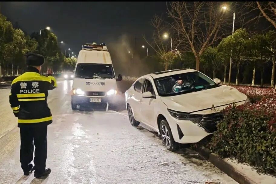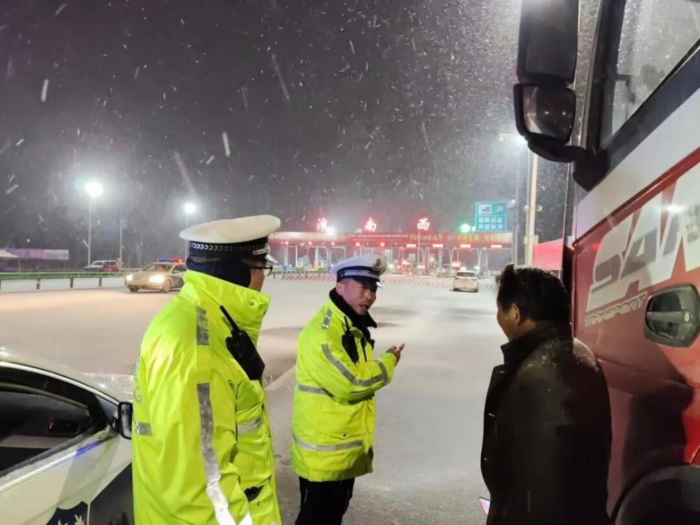 19日夜间,102省道及淮西道口等路段因交通管制滞留大量货车,司乘人员出行受阻。交警谢家集大队冒着严寒赶赴现场,一方面指挥车辆有序前往附近货车驿站休整避险,另一方面为滞留司机送去热水和食物,全力保障司乘人员安全。与此同时,全市各交警大队全警上路、分兵把守:高速一大队在重点桥梁路段定点值守,协调业主单位持续抛撒融雪剂,及时救助受困车辆、快速处置轻微剐蹭事故;凤台县公安局交管大队针对山区、长下坡、桥梁等结冰风险较高路段,集中开展撒盐除冰、巡逻管控与车辆救援;交警田家庵一大队、公路巡逻大队加强路面巡逻及救援力度,连夜处理多起因冰雪天气引发的车辆打滑、追尾事故,及时消除道路安全隐患。