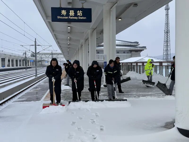 中国铁路上海局淮南西站第一时间启动扫雪除冰保畅通专项预案,统筹部署管内各中间站应急处置工作。各站迅速组建30支扫雪除冰突击队,430余名干部职工放弃休息、全员到岗,按照“先重点后一般、先干线后支线”的原则,手持扫帚、铁钎、除雪机等工具,对线路道岔、信号设备及客运车站站前通道、站台、楼梯等关键区域的积冰积雪展开不间断清扫作业,同时对道岔等核心设备涂抹防冻液,确保其在低温天气下运转正常。