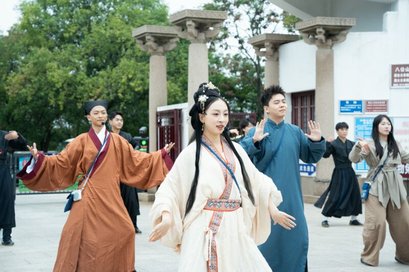 当天上午10点,景区大门前响起激昂的音乐,一场8分钟的开园仪式快闪舞蹈秀准时登场。10余名舞者身着汉服,裙摆随舞步轻扬,时而轻盈旋转,时而组队摆出特色造型;6名武术演员手持长剑登场,劈、砍、刺等动作干脆利落,剑光闪烁间引得观众阵阵惊呼。“太精彩了!舞蹈柔美,武术刚劲!”游客李先生举着手机认真拍照,生怕错过精彩瞬间。据工作人员介绍,这样的快闪秀上午、下午、晚上各有一场,让不同时段入园的游客都能感受到热闹氛围。