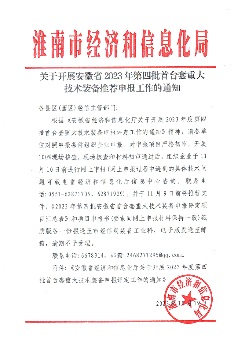 【本级政策】关于开展安徽省2023年第四批首台套重大技术装备推荐申报工作的通知