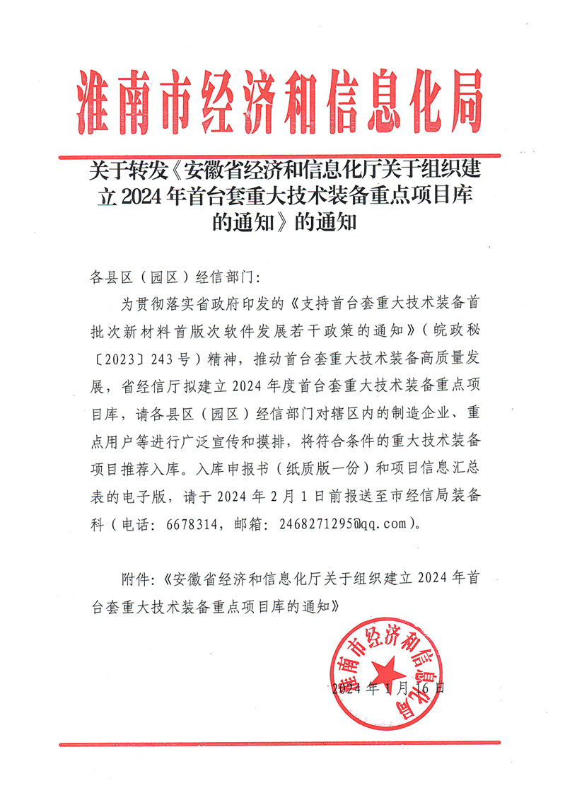 【本级政策】关于转发《安徽省经济和信息化厅关于组织建立2024年首台套重大技术装备重点项目库的通知》的通知