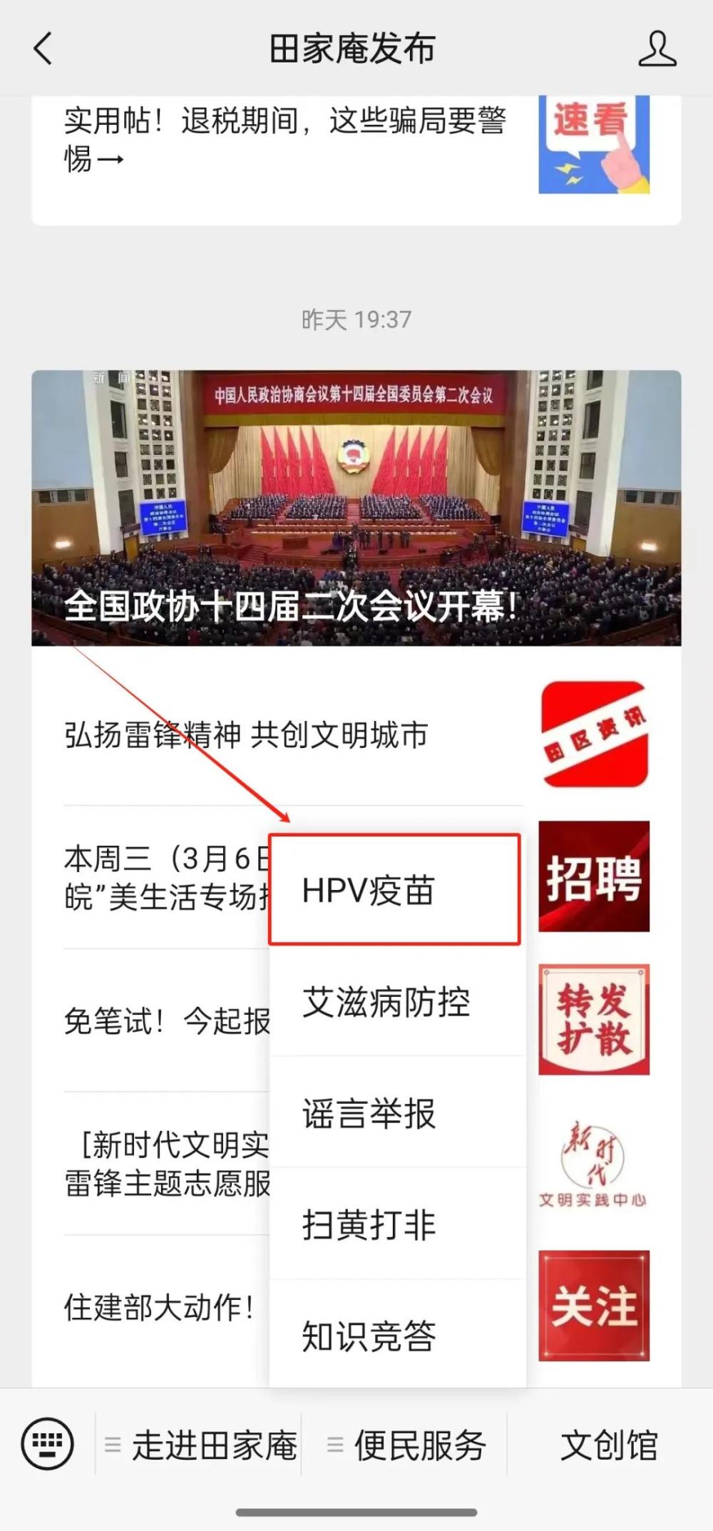 第二步,进入公众号,点击下方“便民服务”,选择子菜单栏“HPV疫苗”进入预约界面,点击“我的”完善个人信息资料填写并保存;