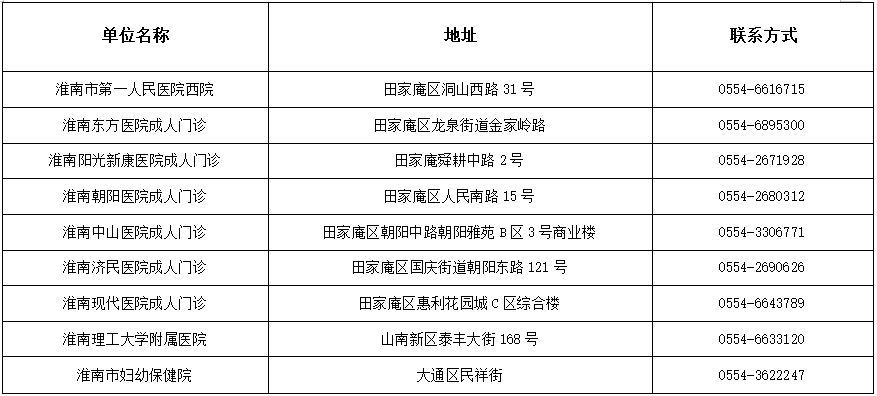 田家庵区预防接种门诊工作时间(8:30-11:30,14:30-17:30),具体地址及联系方式公布如下: