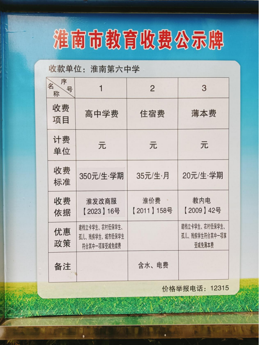 【教育教学领域】2023年淮南第六中学收费公示牌