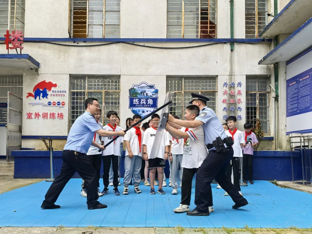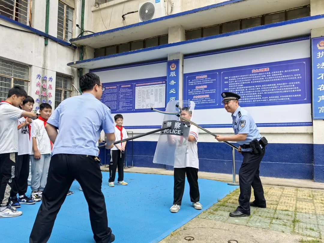 练兵角整齐摆放着的警棍、盾牌、钢叉等警用装备,让同学们应接不暇,随着民警详细演示其用途,“警心”与“童心”互动交流,进一步增强了同学们的安全意识与自我防护技能。