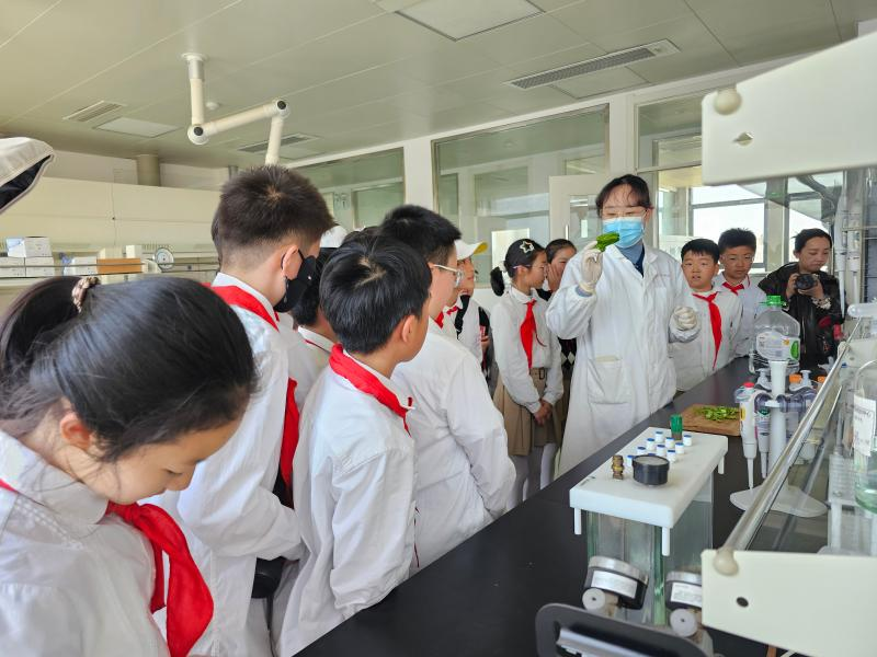 现场,孩子们化身“小小质检员”,亲手操作农药残留快速检测卡分析果蔬样本,用移液枪模拟专业检测流程;通过微生物培养实验观察致病菌形态;用显微镜探索洋葱鳞片叶表皮细胞的微观结构;当维生素C与高锰酸钾发生颜色鲜明的氧化还原反应时,实验室里惊叹声不断……活动还延伸至户外的药用植物园,学生们在薄荷、金银花等中草药种植区观察植株特征,记录生长习性,了解中药材功效,将课本知识与自然实践紧密结合。