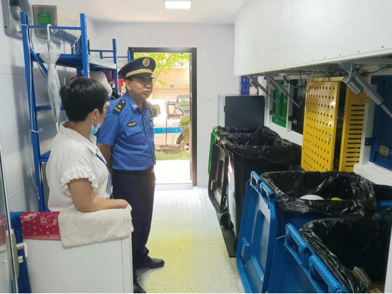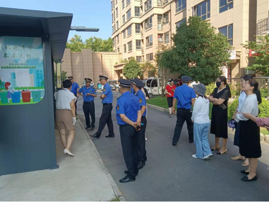 易居东方城小区及瀚城小区是大通区生活垃圾分类示范小区,小区内配备了智能可回收物收集设备供居民自主进行积分兑换,还设置了生活垃圾分类公示栏,展示小区垃圾分类的一些基础信息。一行人在工作人员的带领下来到小区的垃圾分类房进行现场参观学习,工作人员就辖区内生活垃圾集中投放点垃圾桶的摆放、分拣及入户宣传培训等情况一一作了详细介绍。大家听得认真,时不时拍照记录、纷纷点头对大通区垃圾分类工作表示赞许。