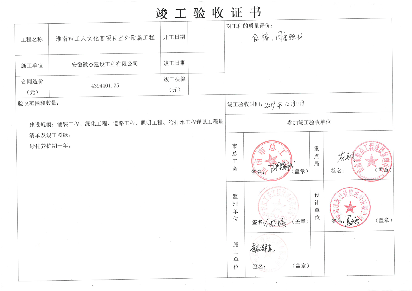 工人文化宫项目室外附属工程竣工验收证书(单项验收)