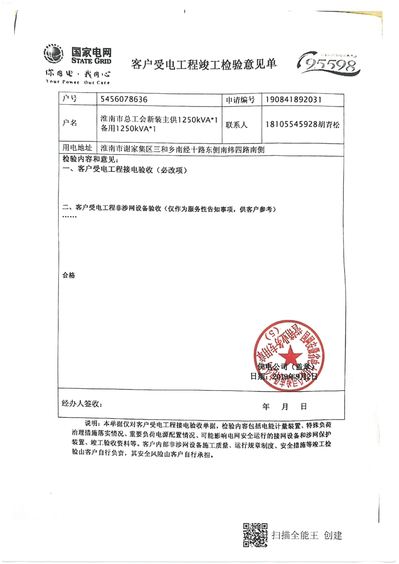 工人文化宫项目供电竣工检验意见单(单项验收)