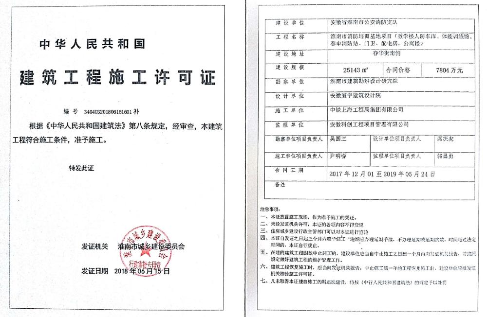 【施工许可证】淮南市消防培训基地项目施工许可证